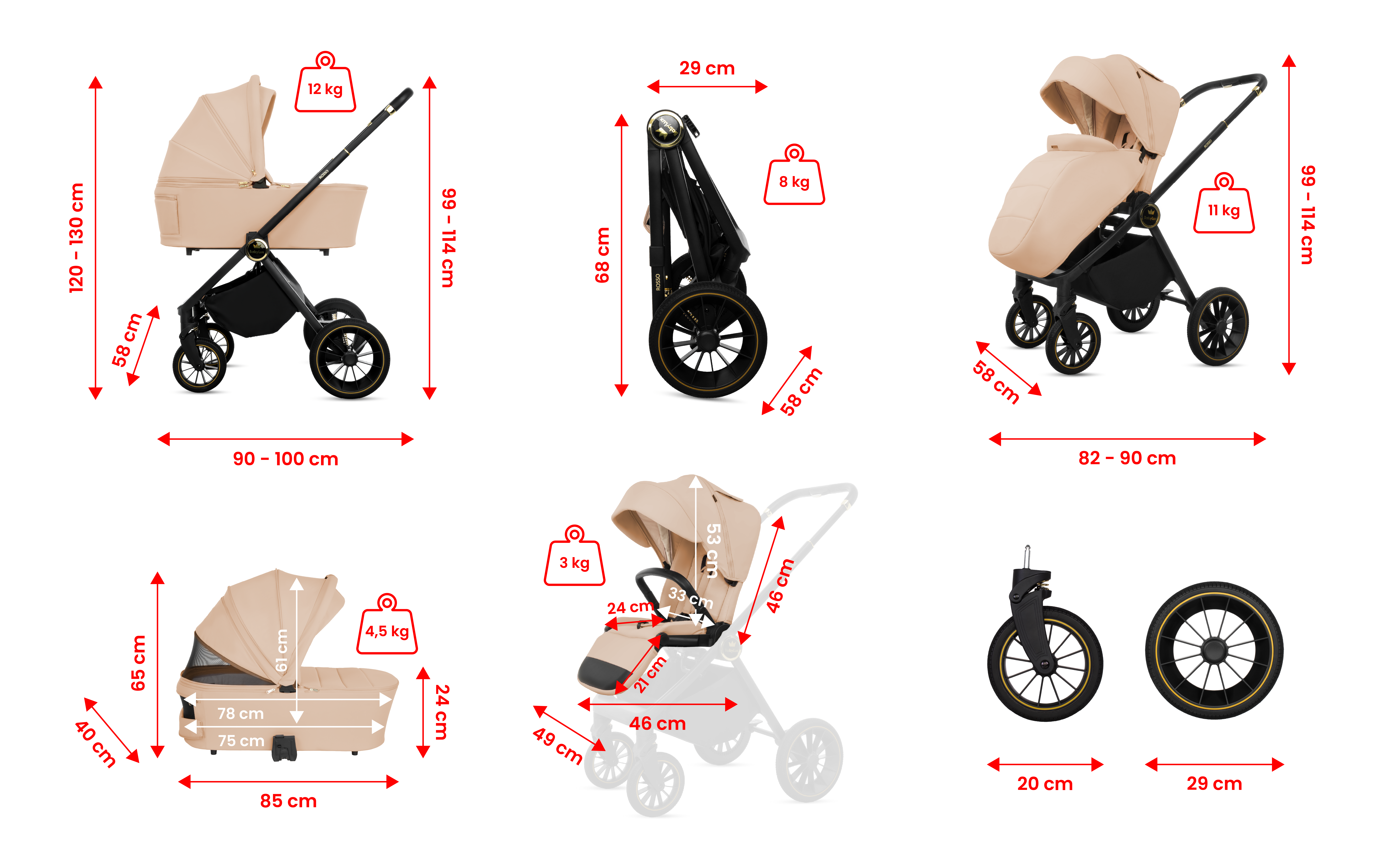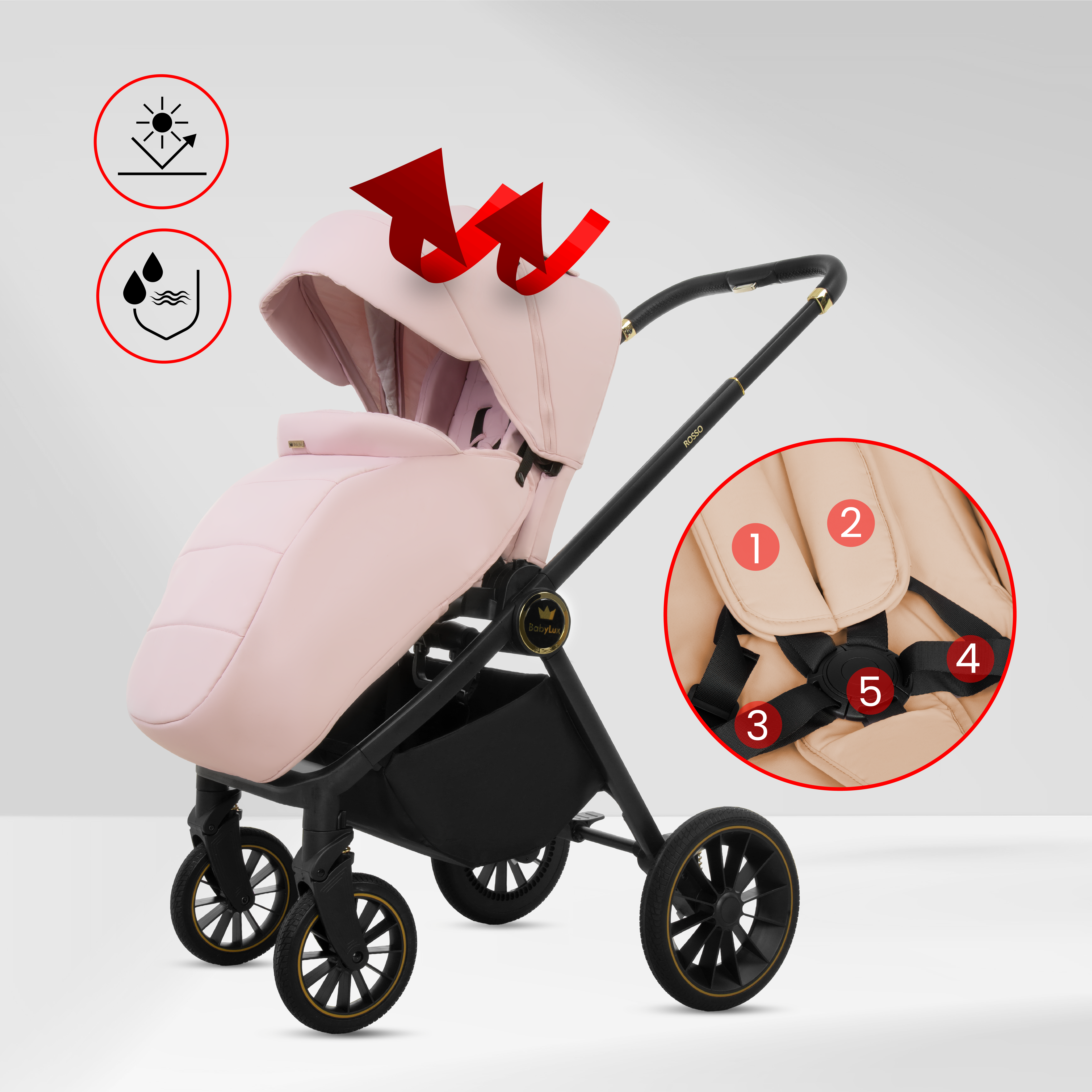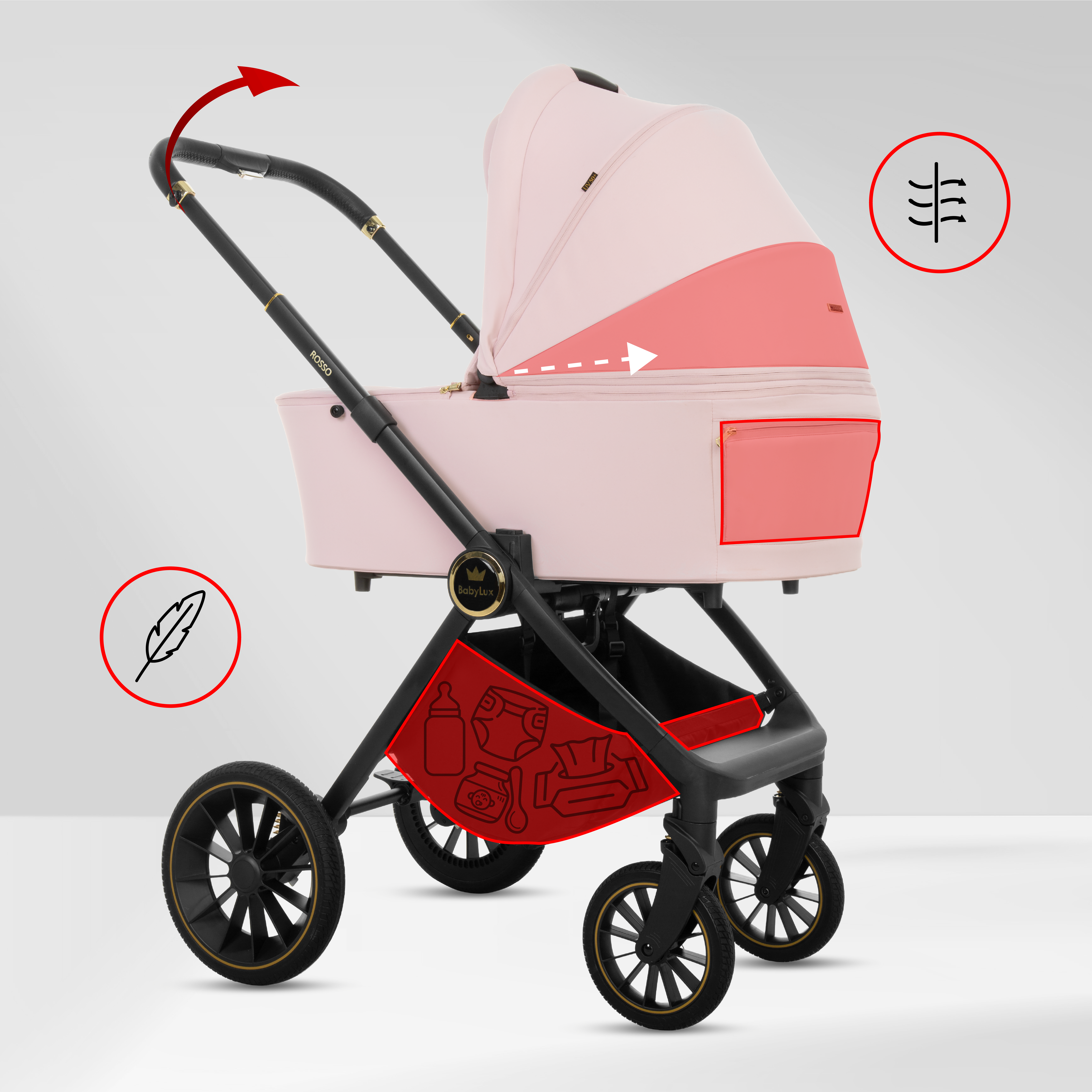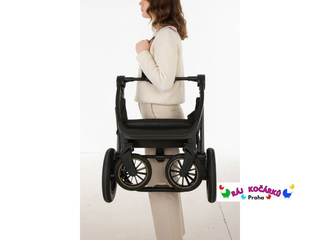 - Systém odpružení: Kočárek využívá nezávislé odpružení všech čtyř kol, které je optimalizováno pro eliminaci vibrací při jízdě na nerovném povrchu.