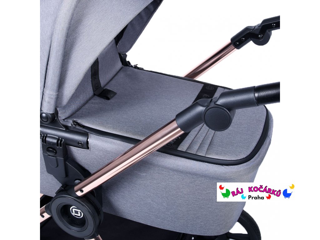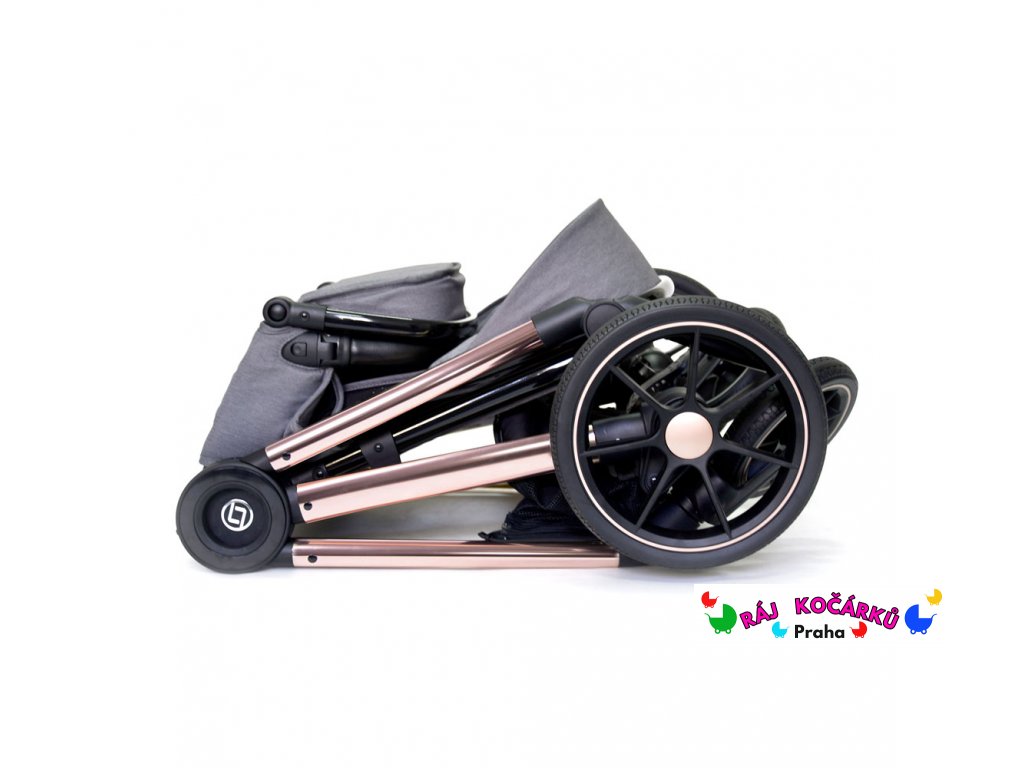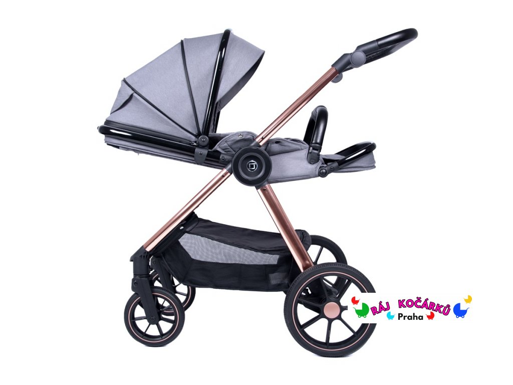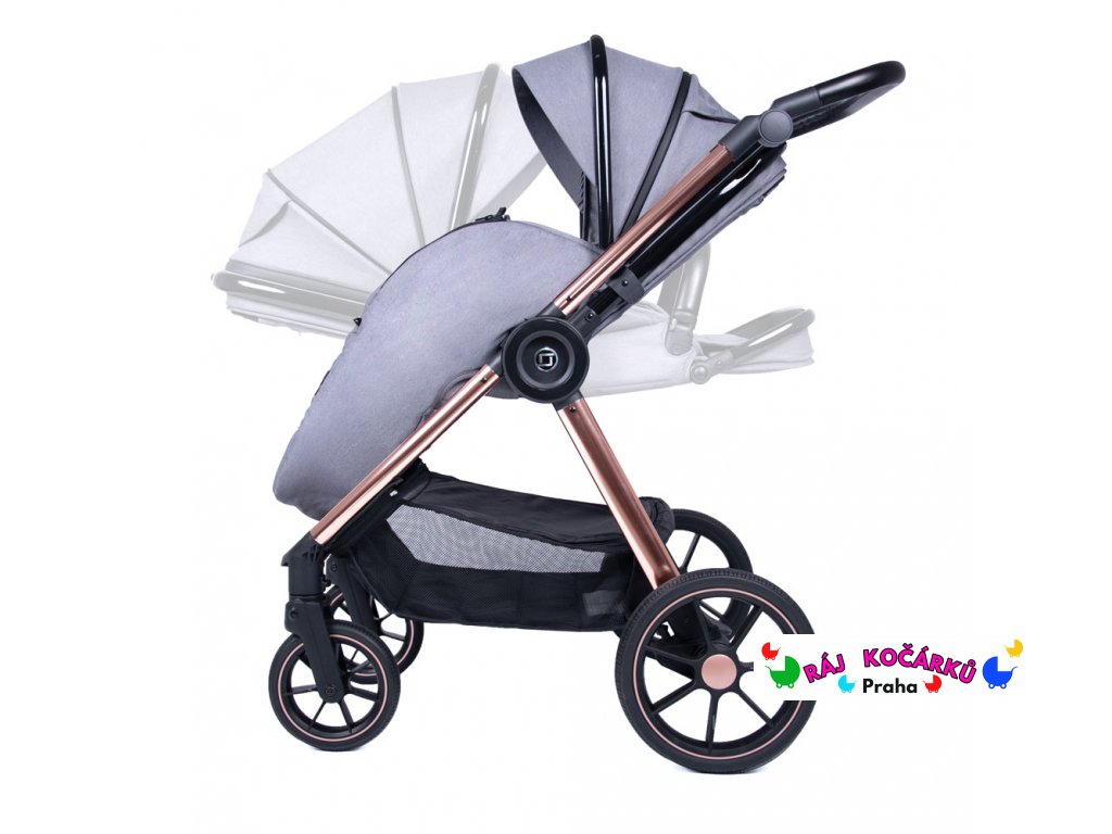 Kočárek se skládá z rámu, který je otočen po směru i proti směru jízdy