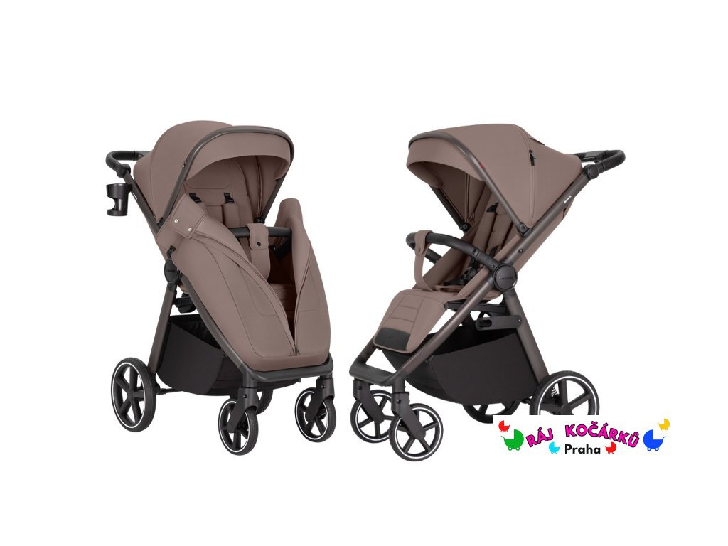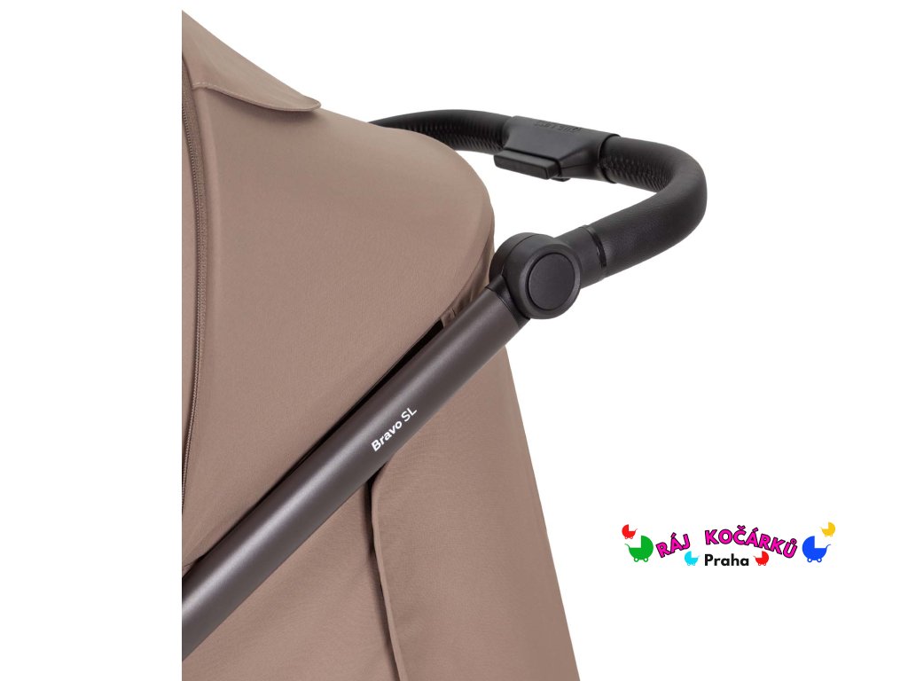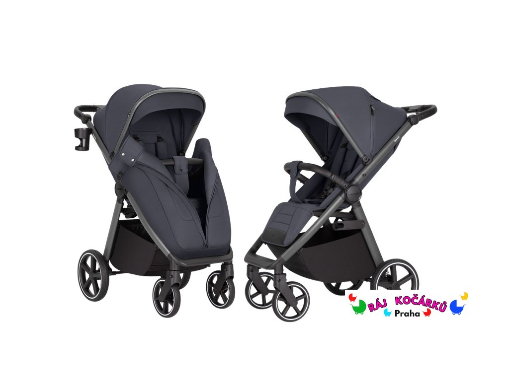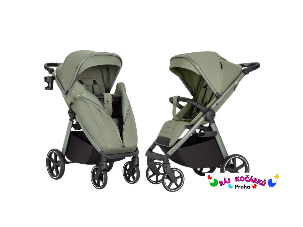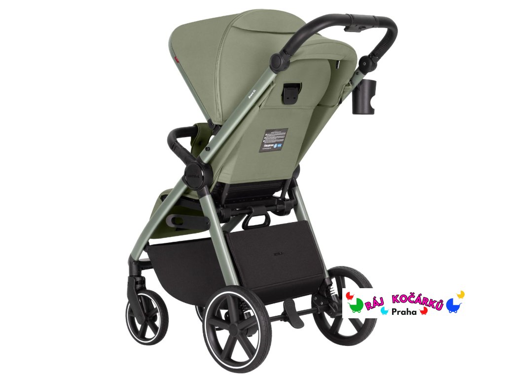 Při složení si kočárek udržuje vzpřímenou polohu a má zámek proti náhodnému rozkládání.