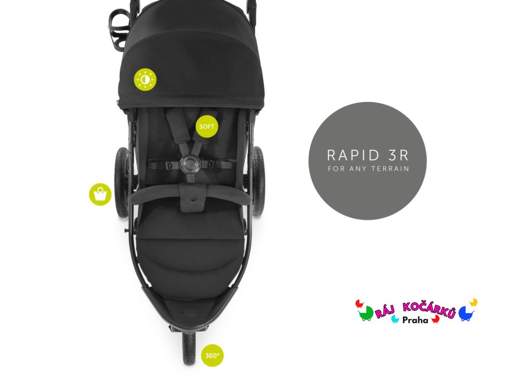Do každého terénu // Tento terénní kočárek díky svým velkým kolům nepokazí žádnou legraci. Vysoce kvalitní gumový profil kol skvěle odpruží nerovnosti na cestách a nehrozí Vám s nimi defekt. Přední kolo je otočné a v případě potřeby jej lze zaaretovat, dělá tak z kočárku Rapid 3R šikovného parťáka.